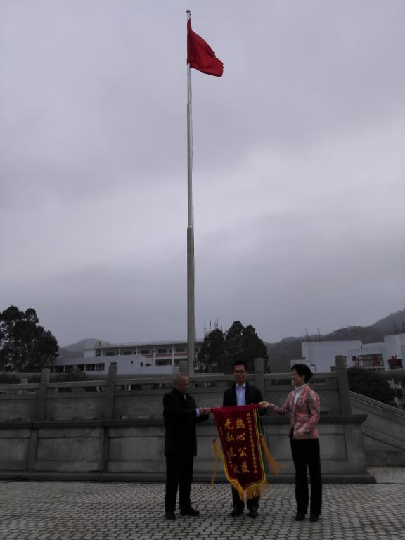榕城区区政府林少佳副区长和榕城区残疾人联合会姚庆生理事长向揭阳职业技术学院蓝星志愿者赠送“热心公益 无私奉献”锦旗,以感谢揭阳职业技术学院师生的公益善举。