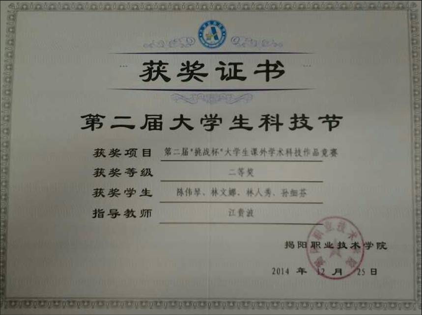 学院第二届“挑战杯大学生课外学术科技作品竞赛二等奖
