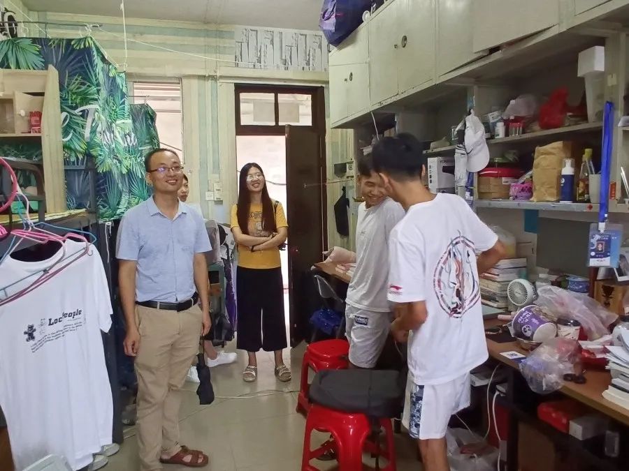 为了能够进一步加强宿舍安全管理工作,更好地掌握返校学生的思想动态和生活状况,充分落实疫情防控工作,进一步落实学生返校的各项工作要求。2021年9月6日下午,化学工程系举行“走访宿舍,传递温暖”的主题活动 。我系党支部副书记陈敏杰、学生党总支书记刘淑媛和辅导员刘月颖老师,以及主席团成员、心理部和生活部的干部干事,共同走访学生宿舍,慰问返校学生。