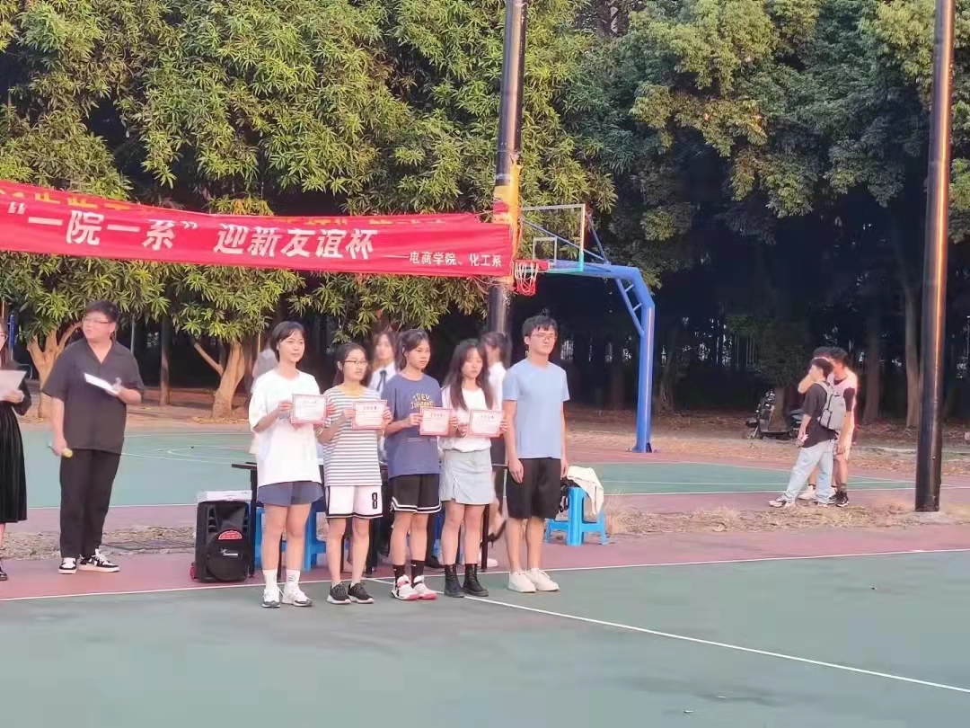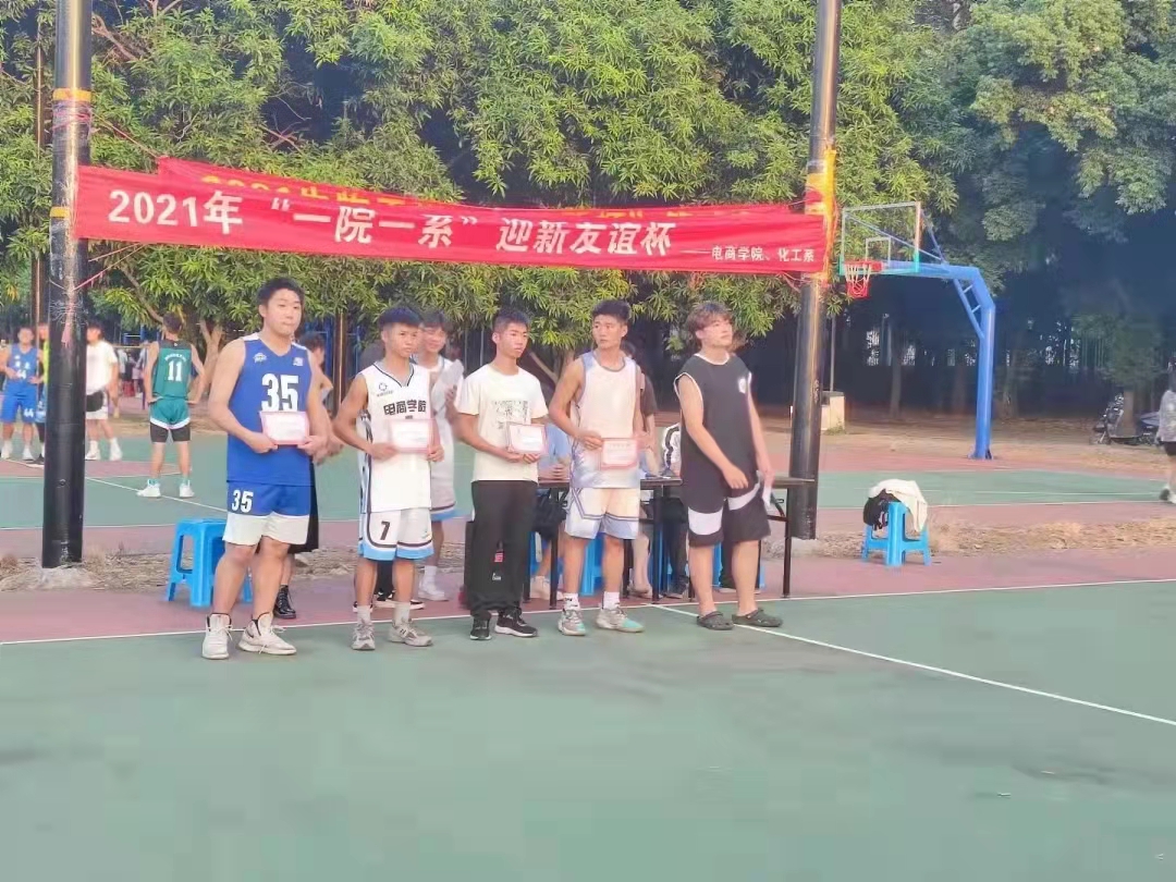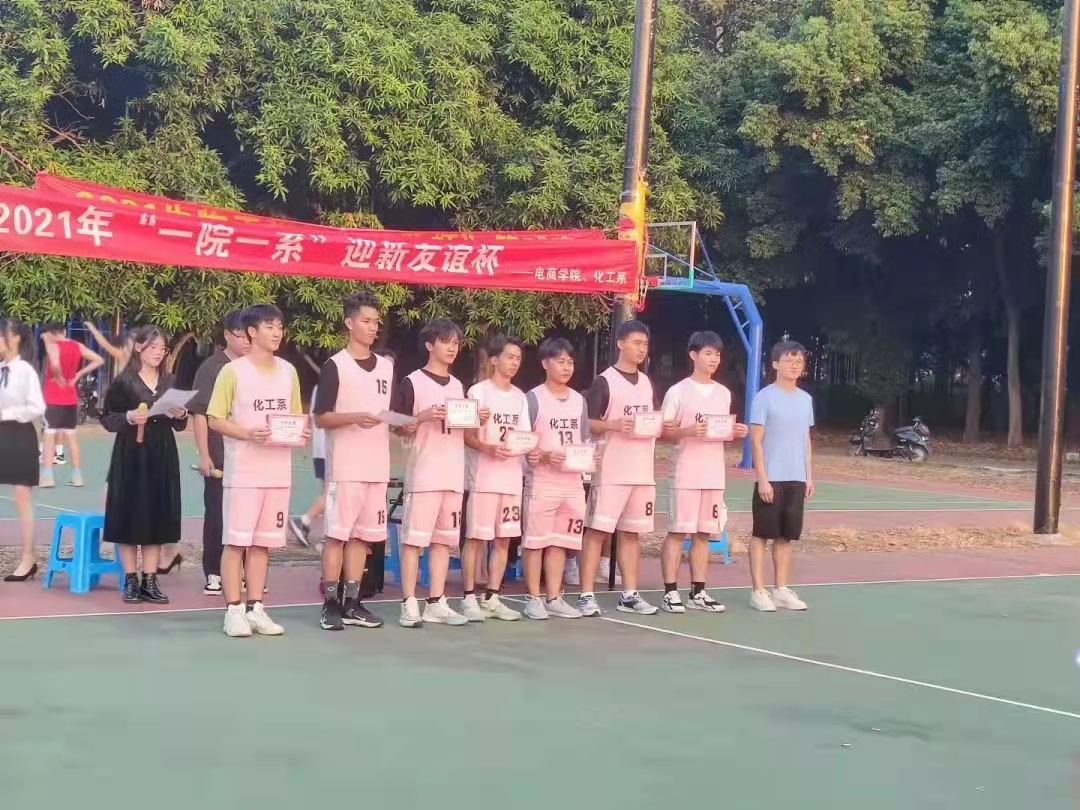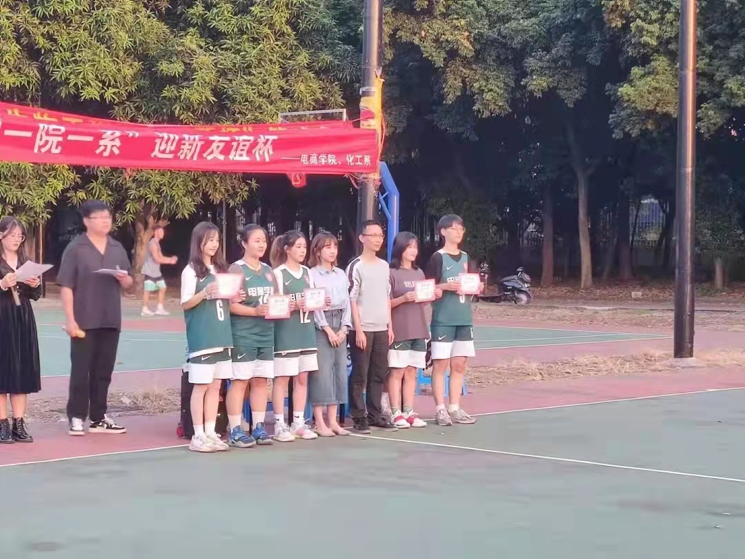 化工系与电商学院联合举办的“新生杯篮球赛”于11月5日在4号球场进行闭幕式活动。此次联合球赛历时8天的活动为我校增添了青春的色彩,也为篮球爱好者提供了大显身手的好机会,产生了“第一名”,“最佳得分王”,“最佳新秀”等14个奖项。闭幕式活动由化工系学生代表主持,出席活动人员包括:电商文体部部长胡得泽,电商林子昊老师,我系学生会副主席郑再武,我系辅导员陈泽纯老师,“一院一系”学生代表和比赛代表队队员。