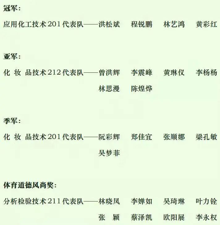 比赛采用三局两胜15分赛制,本次比赛由化工系学生会团总支书记陈泽纯老师担任裁判长,本系学生会相关人员担任裁判员,使比赛公平、公正顺利进行。参赛项目由男单、女单、男双、女双、混双组成,进行比赛。最终按照胜利队伍以班级为单位进行排名。