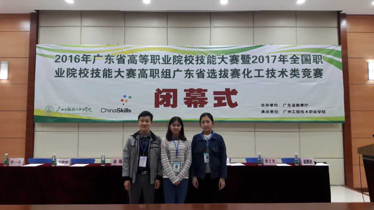 2016年广东省高等职业院校技能大赛暨2017年全国职业院校技能大赛高职组广东省选拔赛“工业分析检验”赛项于2016年12月7日-9日在广州工程技术职业学院举行。我院化学工程系参赛队伍表现不错,获三等奖。(学生:蔡沐霓、朱兰珍;指导老师:林壮森、谢晓龙)