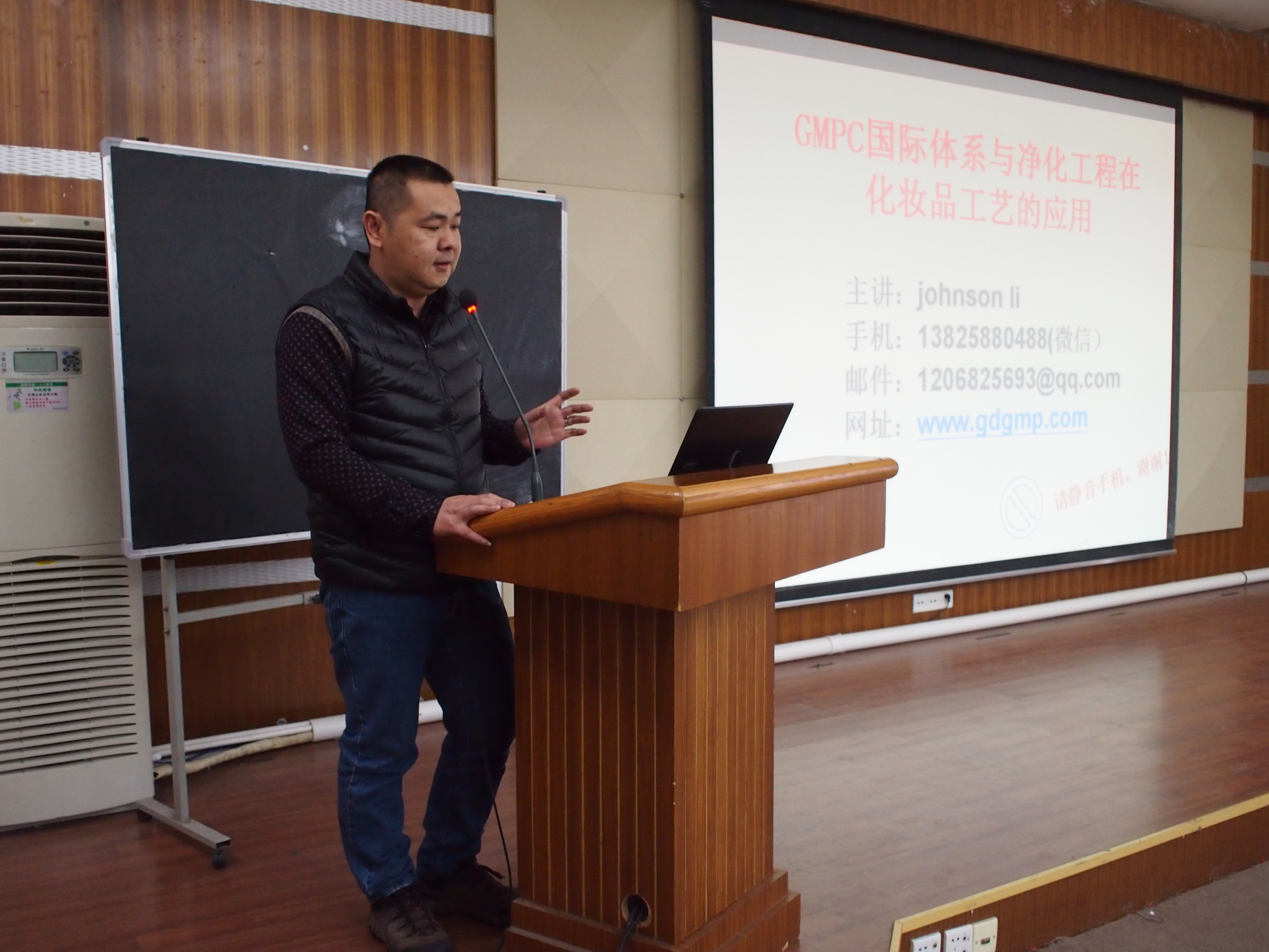 2016年3月24日下午,应化工系领导邀请,汕头中标净化工程有限公司总经理李正强、工程师蔡岳生,广东宝贝儿婴童用品有限公司技术总监夏冷来我院进行学术交流,在与化工系老师座谈交流之后,李正强先生在教学楼AT21为我院师生作了《GMPC净化工程在化妆品工艺中的应用》的专题讲座。讲座由林壮森老师主持,化工系江英志主任、江贵波老师、王宜民老师、林壮森老师、刘淑媛老师、陈敏杰老师等及化工系学生到场聆听讲座。