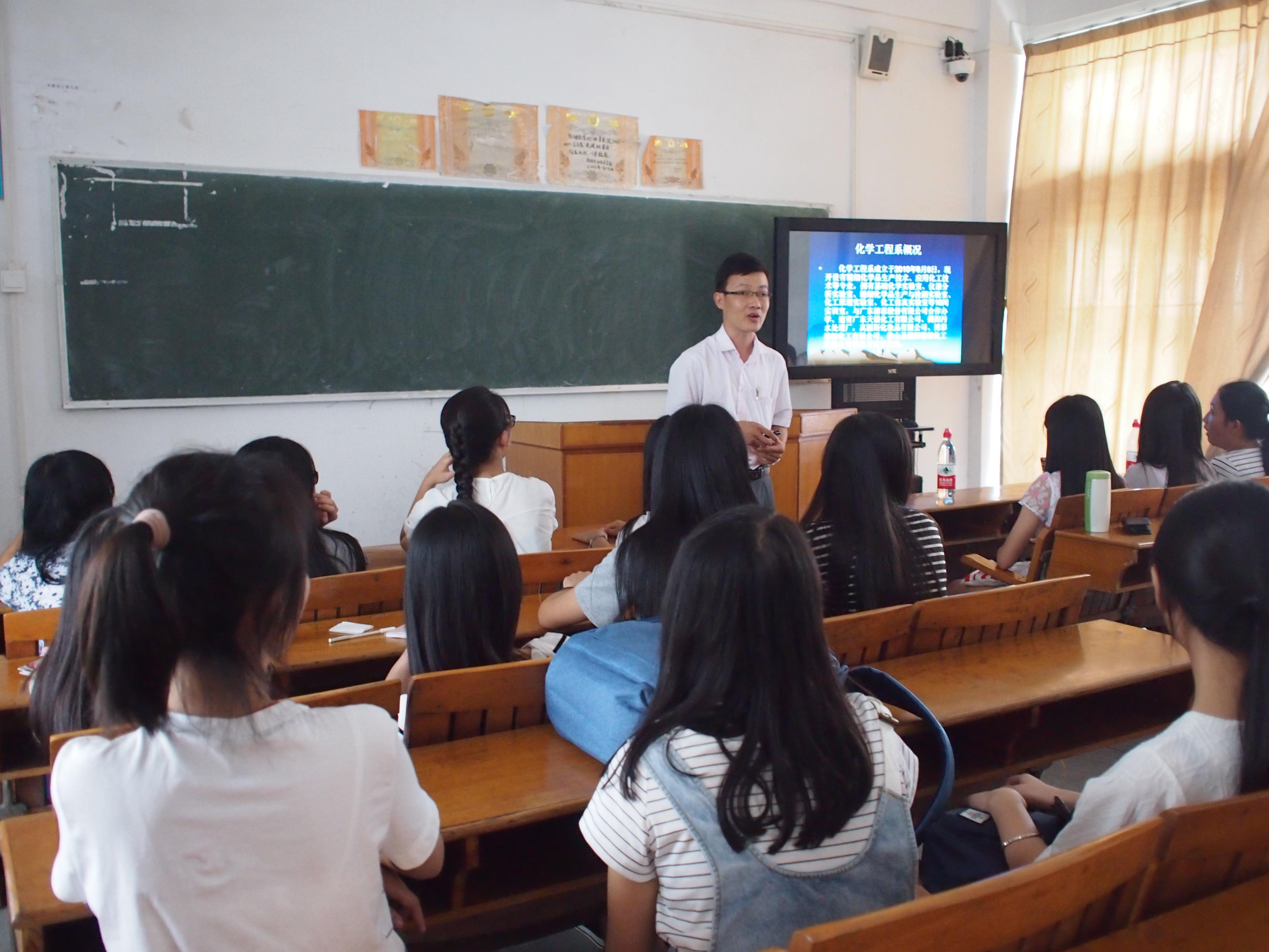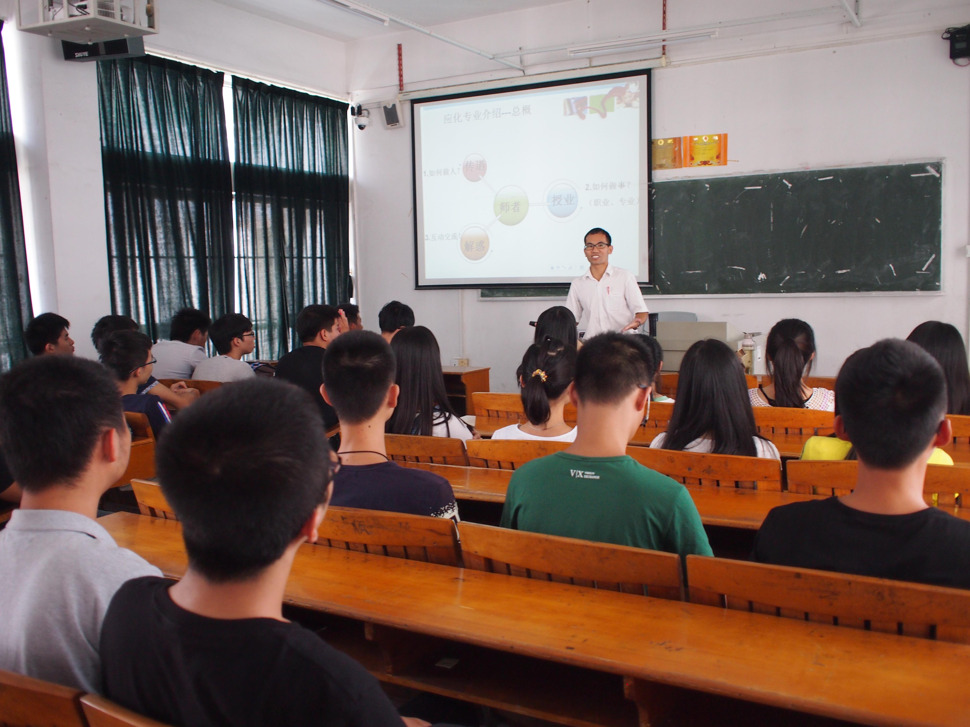 为了让我系新同学更好的了解专业、认识专业,2015年9月13 下午三点,我系分别在教学楼B304和B202召开应用化工技术、精细化学品生产技术专业介绍会,应用化工教研室主任王宜民老师、精细化工教研室主任林壮森老师、辅导员刘淑媛老师、陈关涛老师出席会议,新生班主任助理、全体新同学参加会议。会议分别由刘淑媛老师和陈关涛老师主持。