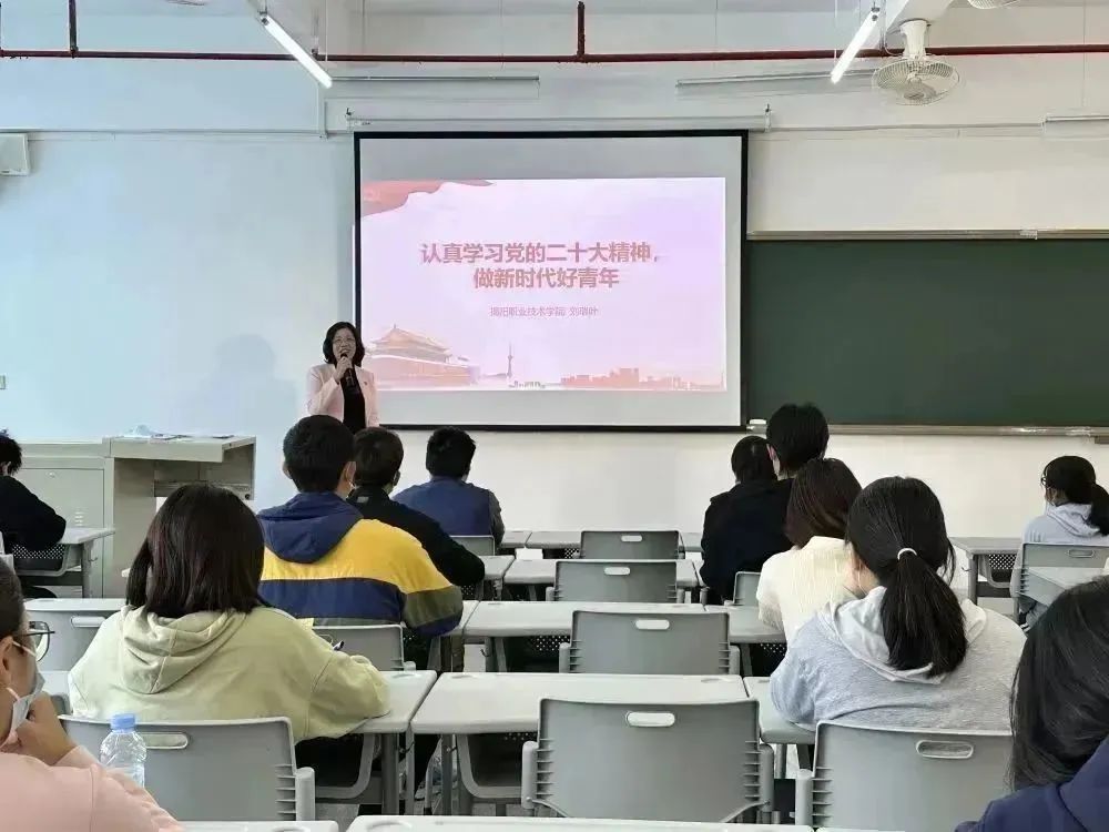 刘瑞叶同志围绕学习贯彻党的二十大精神,主要从党的二十大主题和核心内容、过去五年的工作和新时代十年的伟大变革、党的二十大对青年学生的使命要求三个方面进行详细阐释,让学生深刻认识新时代十年伟大变革,看清楚过去为什么能成功,弄明白未来怎样才能继续成功,引导新时代青年学生铭记奋进历程,激扬奋进力量,听党指挥跟党走,把思想和行动统一到党的二十大精神上来,自信自强、守正创新,踔厉奋发、勇毅前行,共同推动中华民族伟大复兴号巨轮乘风破浪、扬帆远航。