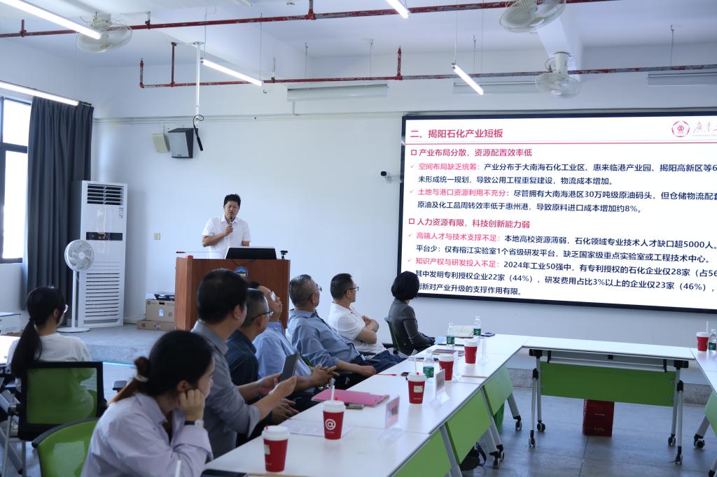 学校教务处处长林若波以《联合体建设规划》为题进行汇报,阐述了联合体的建设目标与实施路径。6位来自高校、园区领导及企业家代表,分别围绕党建引领、绿色石化产业人才培养、专业建设与发展路径等主题作专题报告。广东工业大学章泽杰博士深入剖析了《揭阳绿色石化产业的定位与思考》,为产业发展提供了理论支持;化工系主任江英志以《化工专业“五金”建设的情况与实践反思》为题,分享了专业建设的经验与成果;大南海石化工业区产业投资促进局副局长顾高铨则阐述了《揭阳大南海石化工业区规划蓝图与发展愿景》,展示了园区的未来发展方向;广东伊斯科新材料科技发展有限公司王硕经理以《从企业需求角度看学生核心能力的培养》做了汇报;广东东粤环保科技有限公司王云生经理分享了《企业人才招聘中存在的问题及对策》;化工系党总支书记钱德明以《党建引领,携手共建大南海绿色石化产教联合体》为主题,传达学习了党的二十届四中全会精神,强调了党建在产教融合中的重要作用。